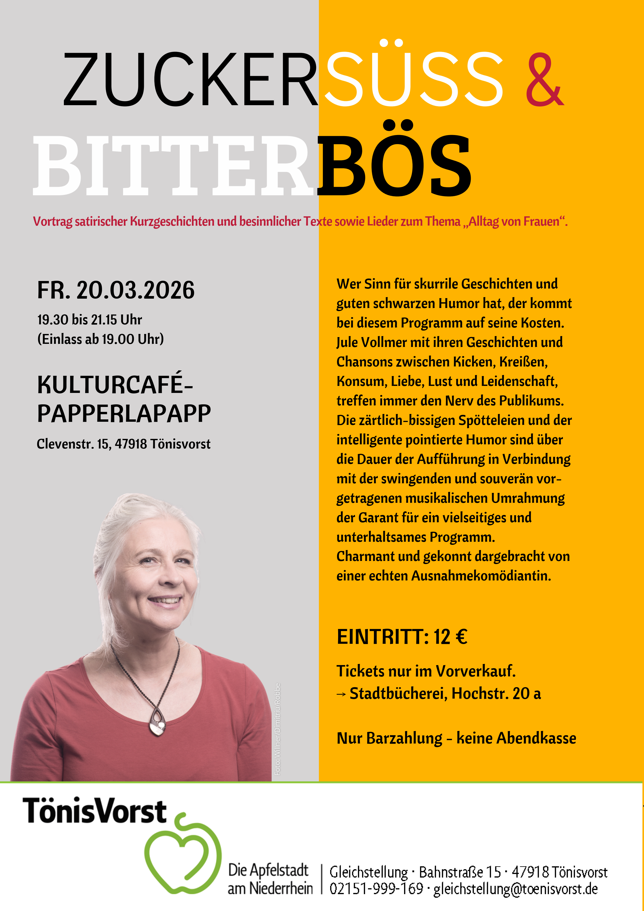 Tickets nur im Vorverkauf in der Stadtbücherei, Hochstr. 20 a, 47918 Tönisvorst – keine Abendkasse!